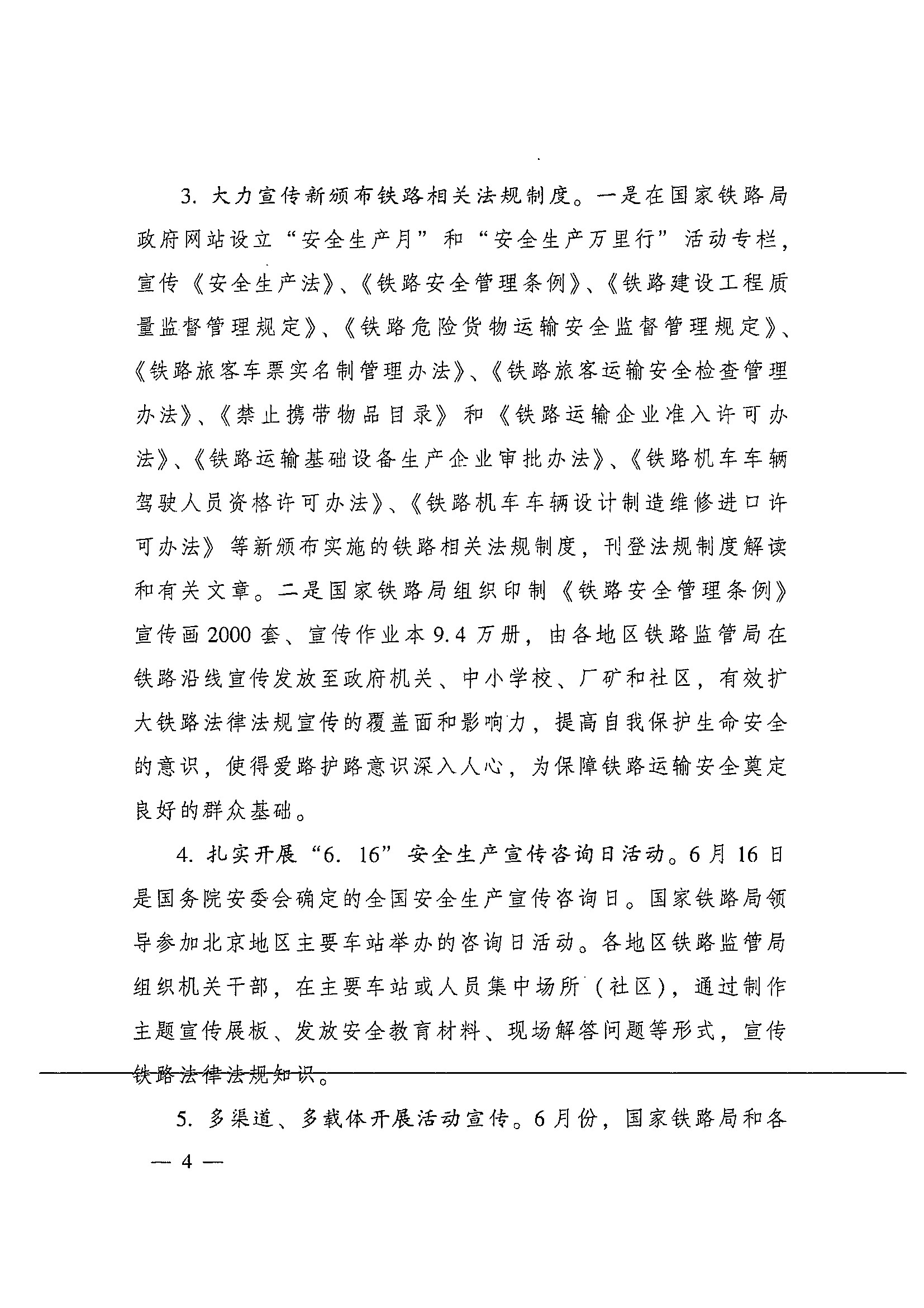 3.大力宣傳新頒布鐵路相關法規制度。活動開展期間,組織印刷一批有關鐵路安全的宣傳畫和宣傳冊,聯合各鐵路運輸企業,發放至鐵路沿線的地方政府機關、中小學校、廠礦和社區,有效擴大鐵路法律法規宣傳的覆蓋面和影響力,提高自我保護生命安全的意識,使得愛路護路意識深入人心,為保障鐵路運輸安全奠定良好的群眾基礎。