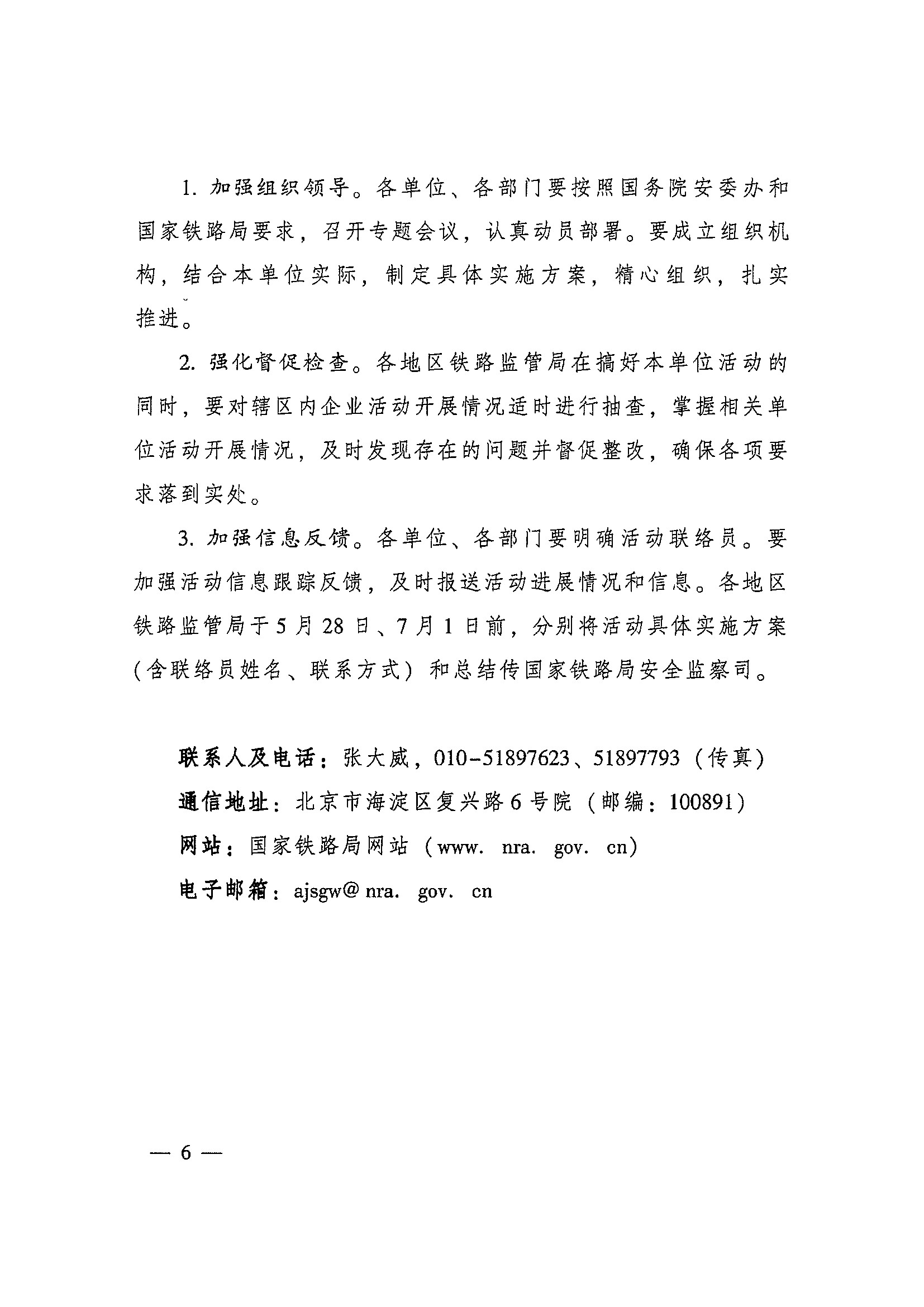 1.督促相關鐵路企業認真開展“安全生產月”和“安全生產萬里行”活動。各處室要及時掌握轄區內相關企業活動開展情況,督促企業落實相關要求。及時總結活動開展過程中好的經驗和做法并進行宣傳。