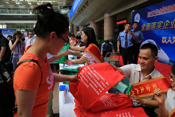 國家鐵路局工作人員為旅客發(fā)放鐵路安全生產宣傳資料。