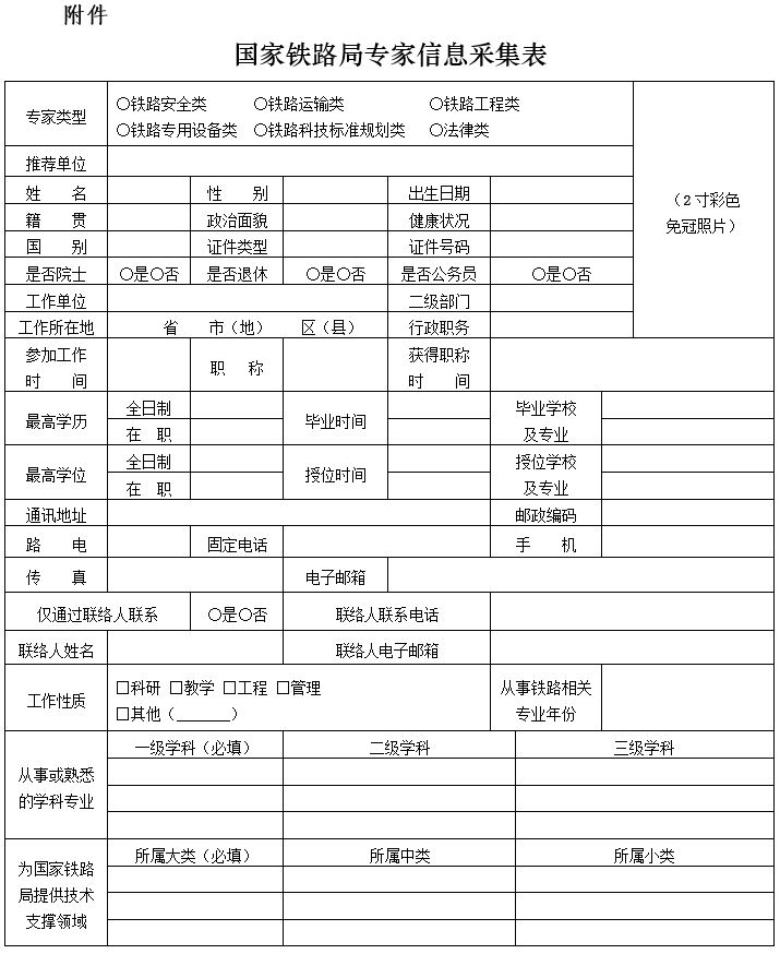 第七條 設備專家入庫的主要程序是:國家鐵路局發出邀請通知,個人、單位進行推薦,被推薦個人填寫《國家鐵路局專家信息采集表》(格式見附件),由個人或推薦單位按規定時限統一報設備監督管理司審定,經設備監督管理司審核和公示(需保密的除外)后入設備專家庫。