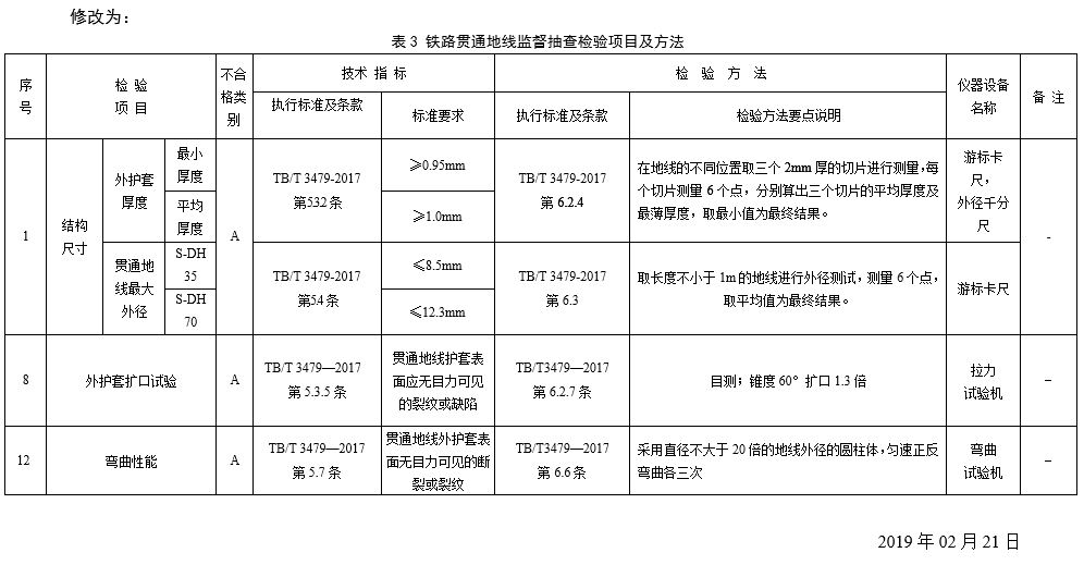 《鐵路貫通地線-鐵路專用產品質量監督抽查檢驗實施細則》(GTCC-001-2018)更正內容