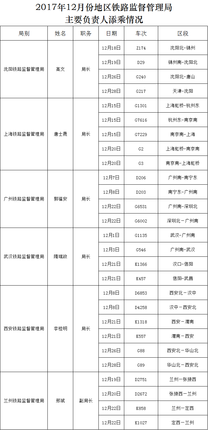 上一篇:2017年12月份地區(qū)鐵路監(jiān)督管理局主要負責人添乘情況
