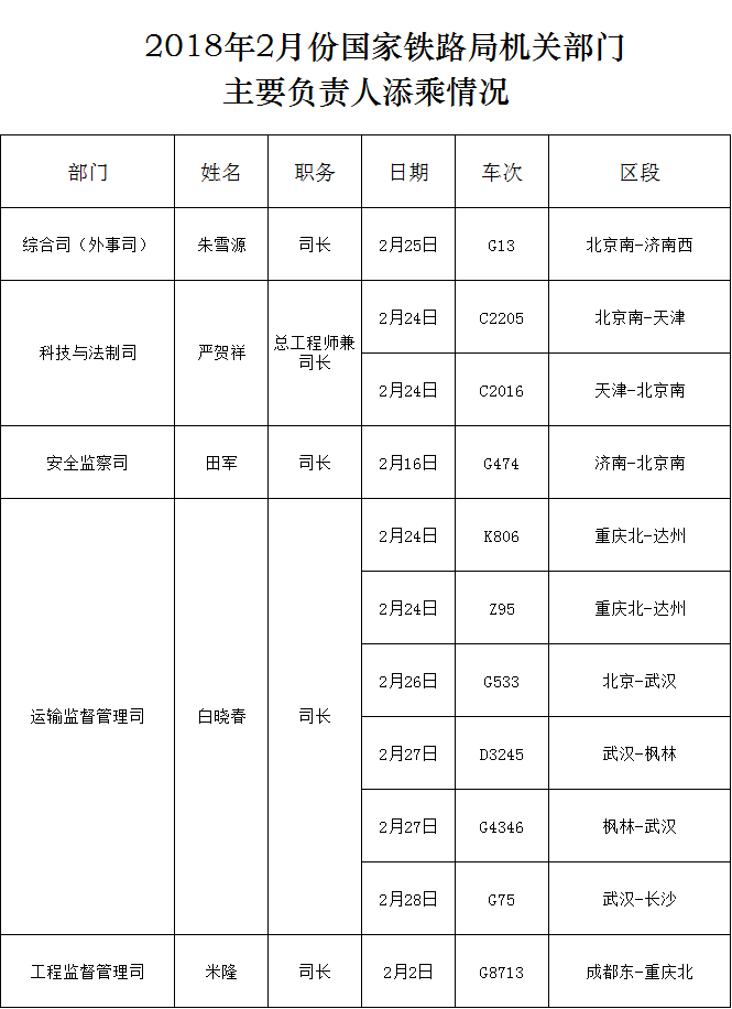 上一篇:2018年2月份國家鐵路局機關部門主要負責人添乘情況