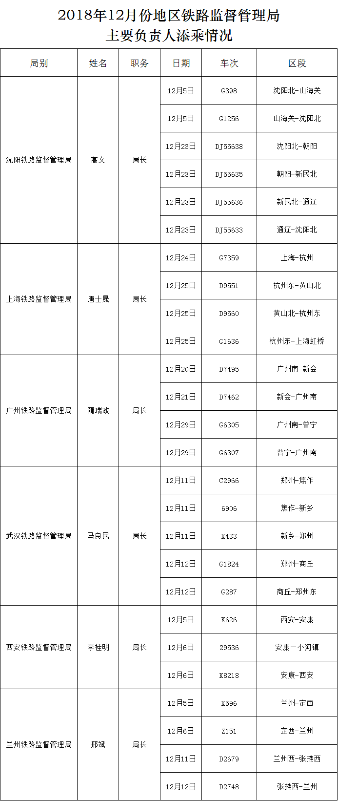 下一篇:2018年12月份地區鐵路監督管理局主要負責人添乘情況