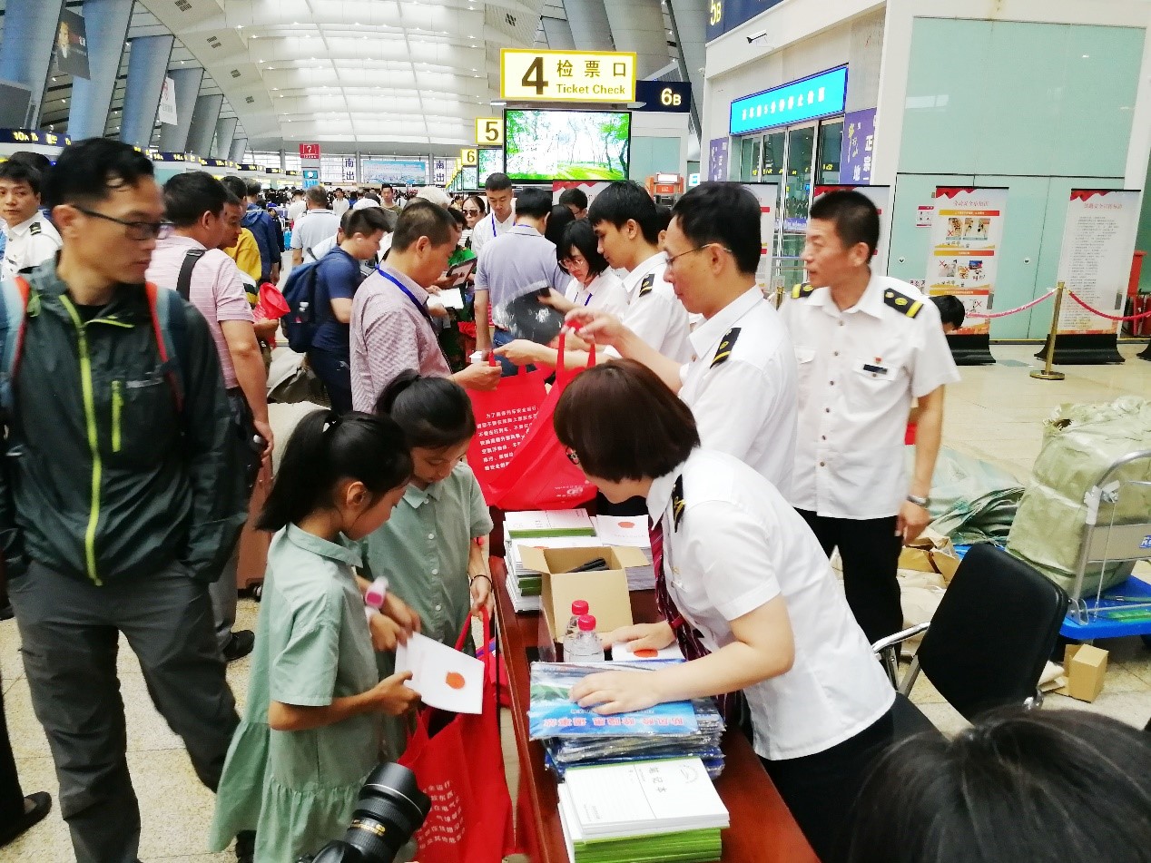 北京南站候車大廳設(shè)立宣傳咨詢臺(tái),車站工作人員向旅客宣傳安全知識(shí)、解答問(wèn)詢、發(fā)放安全宣傳品。