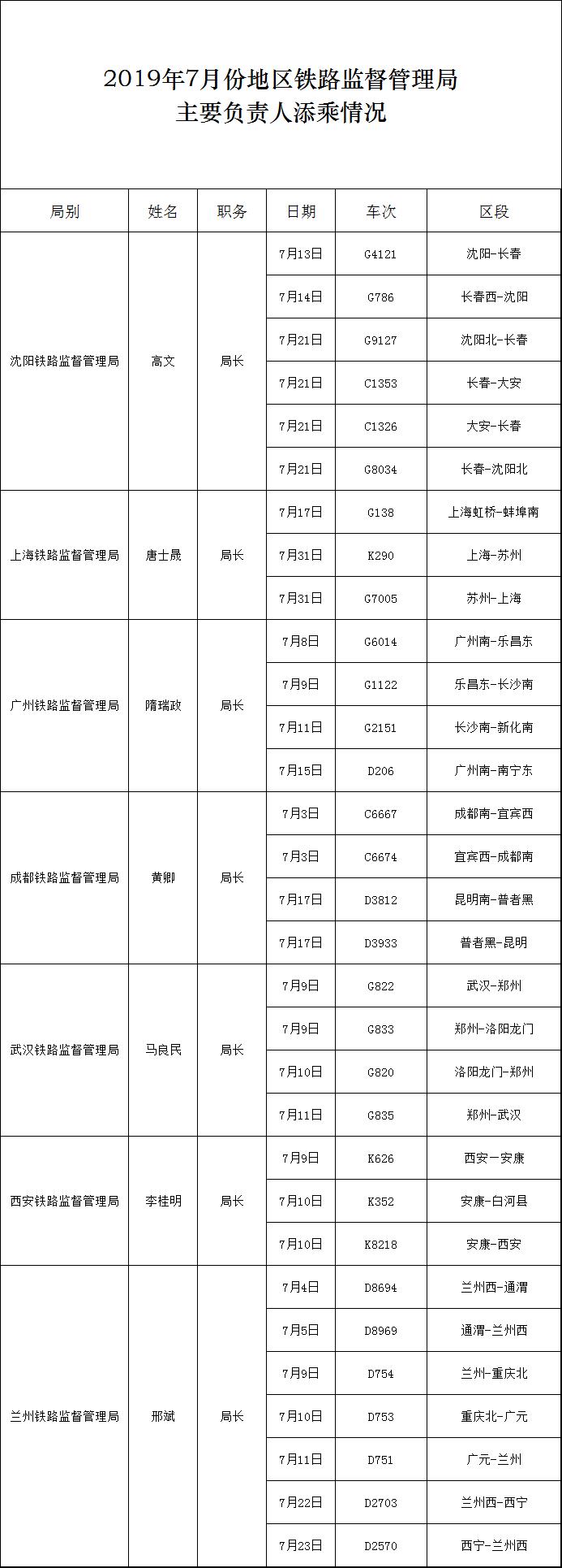 下一篇:2019年7月份地區鐵路監督管理局主要負責人添乘情況