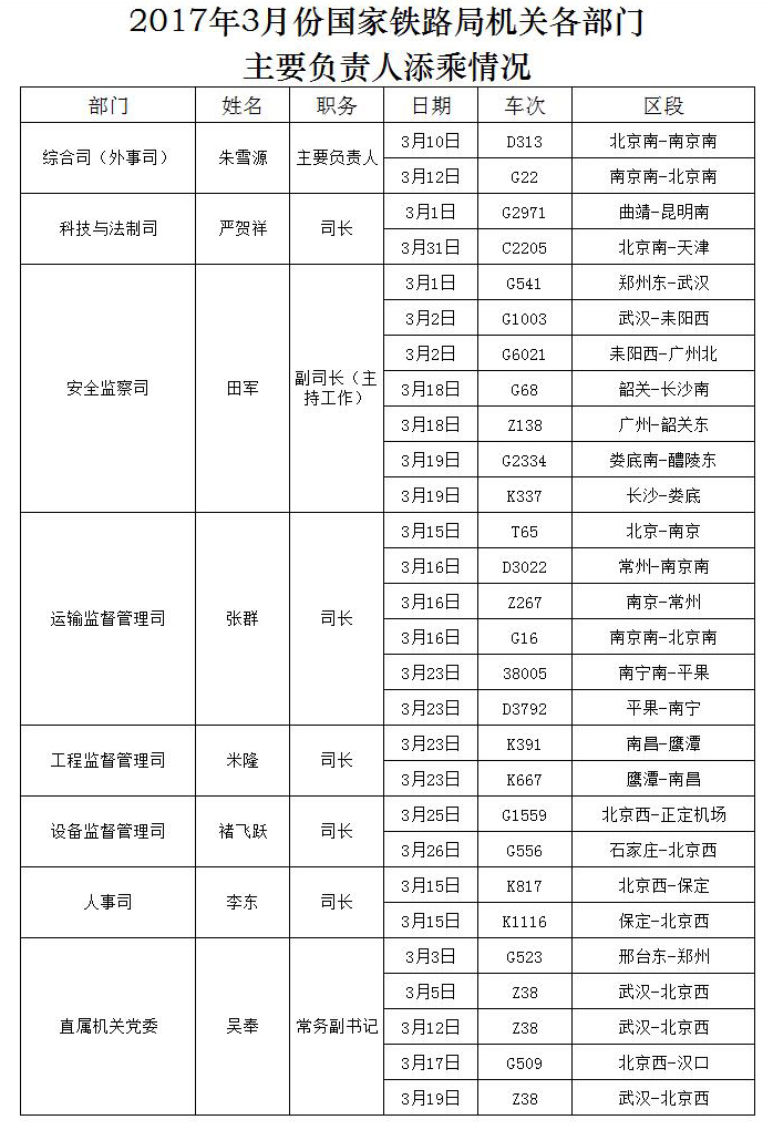 下一篇:2017年3月份國家鐵路局機(jī)關(guān)各部門主要負(fù)責(zé)人添乘情況