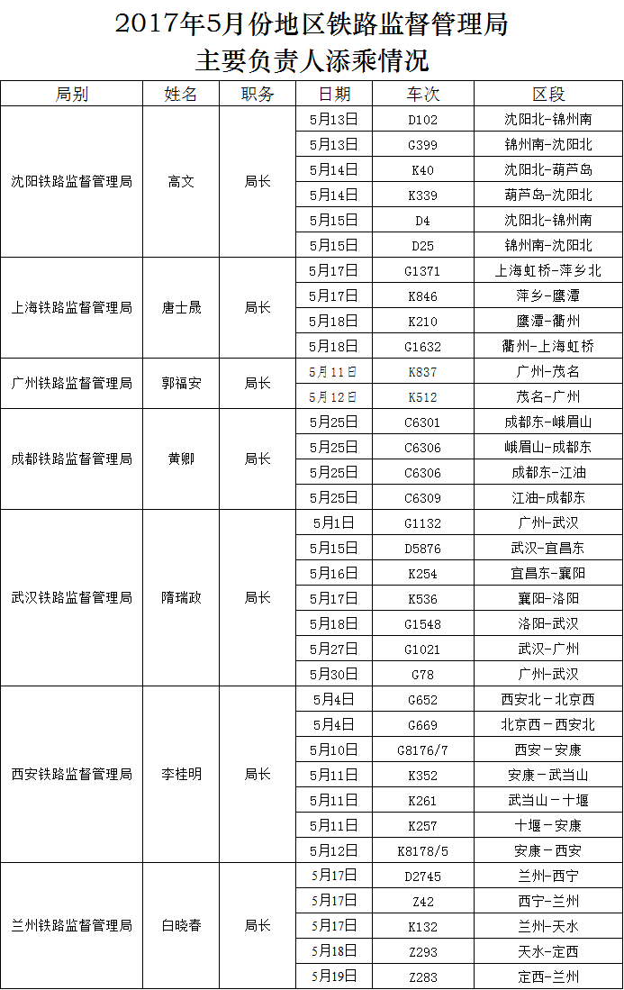 上一篇:2017年5月份國家鐵路局機關(guān)各部門主要負責(zé)人添乘情況
