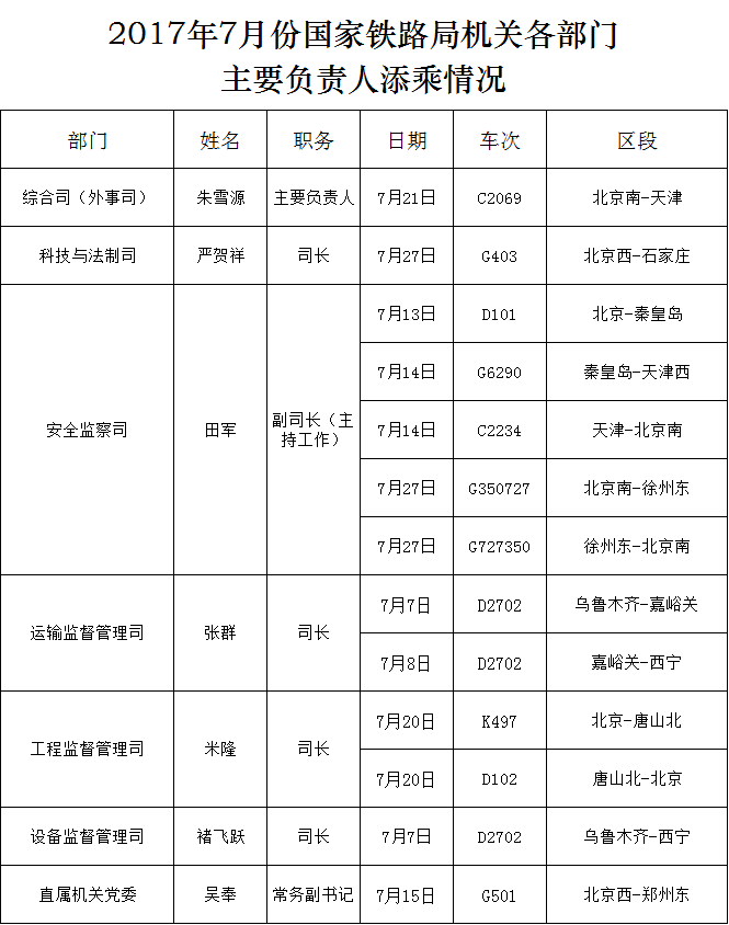 下一篇:2017年7月份國家鐵路局機關各部門主要負責人添乘情況