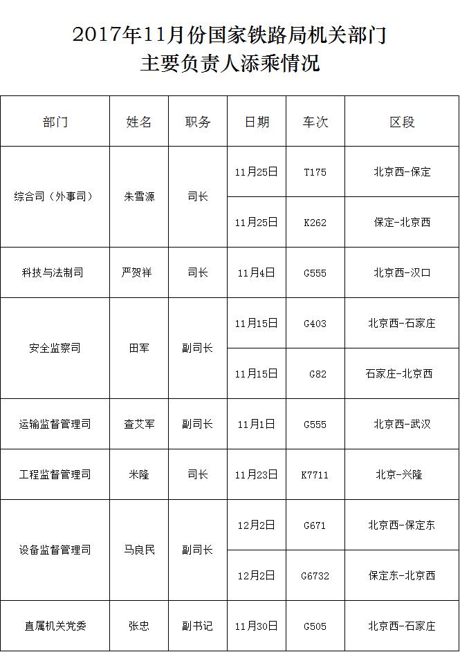 上一篇:2017年11月份國家鐵路局機關部門主要負責人添乘情況