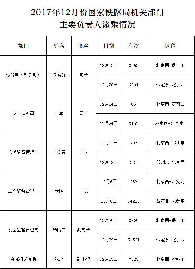 上一篇:2017年12月份國家鐵路局機關部門主要負責人添乘情況