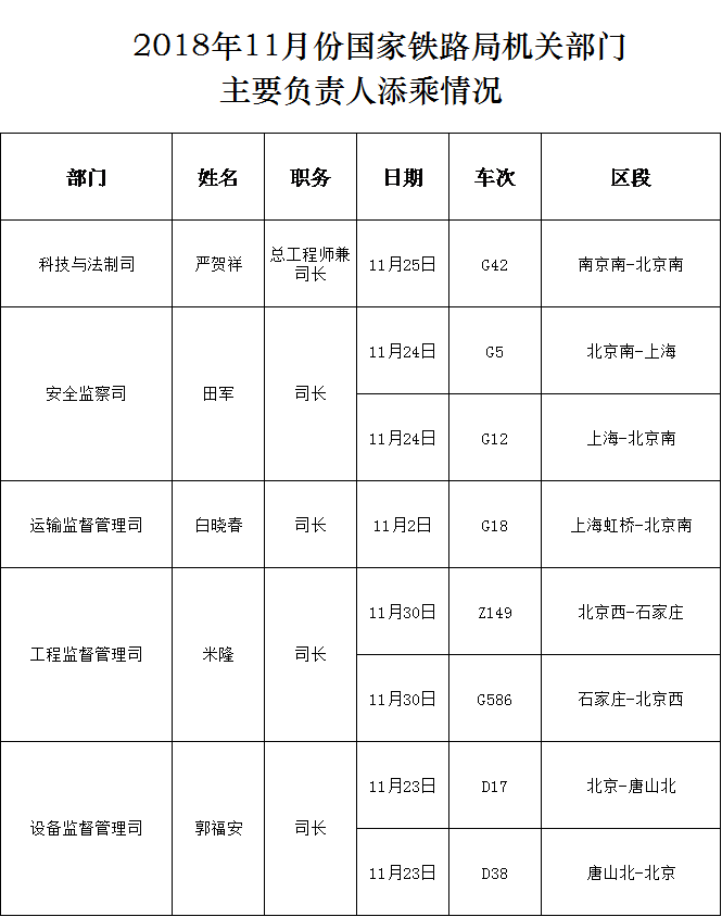 上一篇:2018年11月份國家鐵路局機關部門主要負責人添乘情況