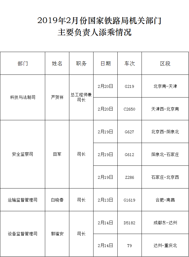 上一篇:2019年2月份國家鐵路局機(jī)關(guān)部門主要負(fù)責(zé)人添乘情況