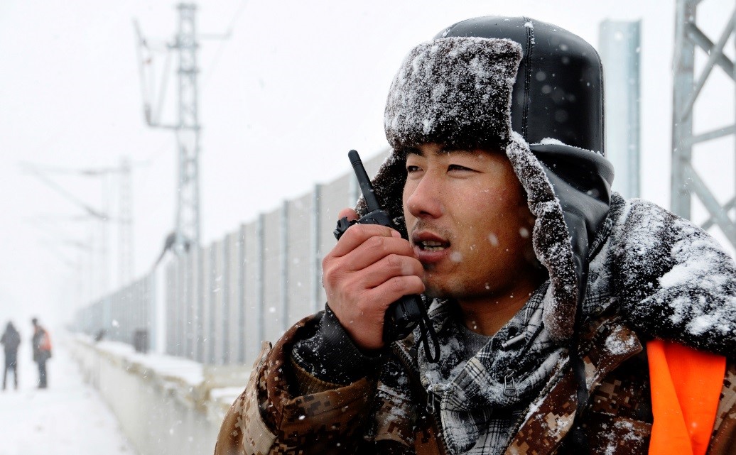 中鐵電化局集團施工技術(shù)人員正在丹大快速鐵路大洋河特大橋上冒著大雪安裝接觸網(wǎng)供電設(shè)備。當日,遼寧丹東地區(qū)普降中到大雪,氣溫突降至零下10℃度左右,風力4到5級。楊永乾 攝