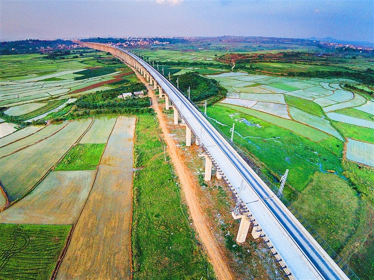 海南省澄邁縣老城鎮(zhèn)龍吉村,建設(shè)中的西環(huán)鐵路穿過綠色鄉(xiāng)村田野。