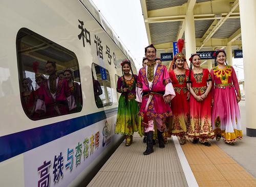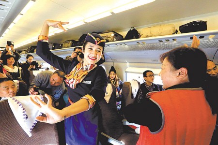 2014年12月26日蘭新高鐵開(kāi)通運(yùn)營(yíng), D2702次列車(chē)上,“動(dòng)姐”地里達(dá)爾·阿不都拉和旅客一起歡跳維吾爾族民間歌舞“麥西來(lái)甫”。