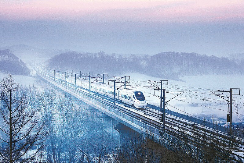 一列動車組列車在林海雪原上奔馳。入冬以來,越來越多的旅客乘坐東北高鐵,領略北國冬日美景。劉慎庫 攝
