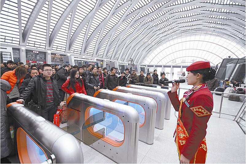 客運員向旅客講解自動檢票閘機(jī)使用方法,并提示出行注意事項。