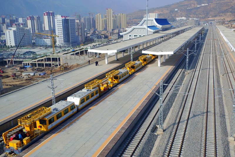 鐵路工程車輛停靠在即將投入運營的隴南車站股道上。
