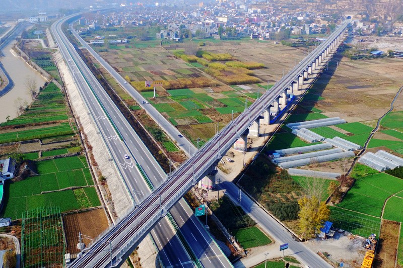 蘭渝鐵路隴南境內的漢王白龍江特大橋(上)與高速公路交錯。
