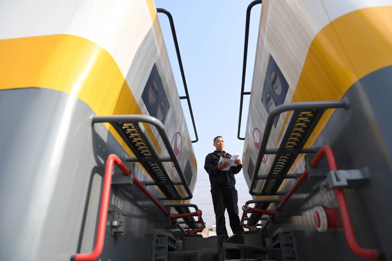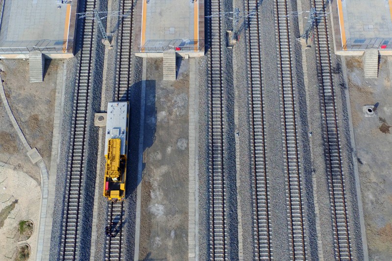 2016年11月30日,蘭(蘭州)渝(重慶)鐵路岷縣至廣元段開始電力機車熱滑試驗,進入正式開通運行前全面動態檢測驗收階段。蘭渝鐵路是連接我國西北與西南的重要鐵路干線,也是重慶經新疆阿拉山口、連接歐洲的國際物流大通道“渝新歐”鐵路的重要組成部分。圖為蘭州鐵路局蘭州供電段兩名工作人員在隴南車站站臺上對接觸網工作車進行檢查。