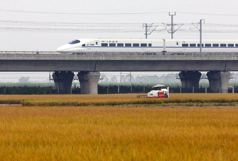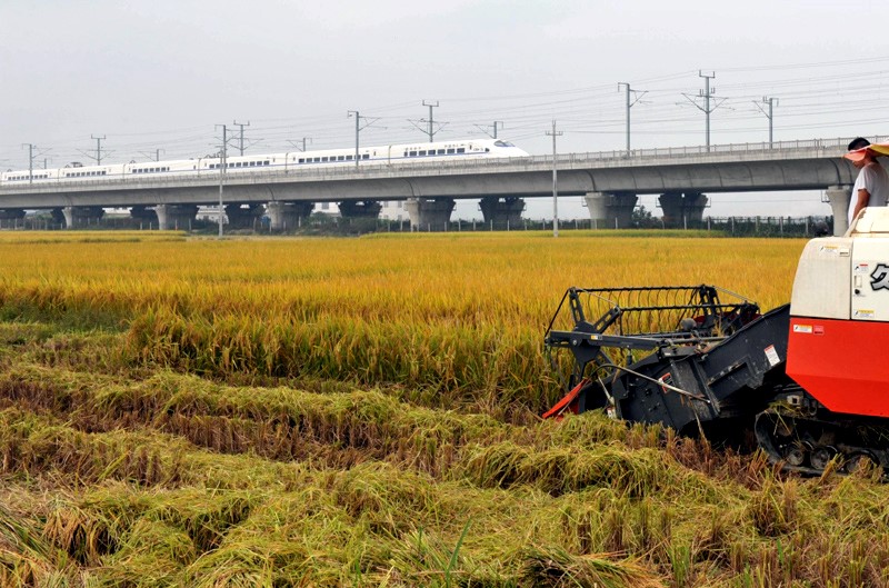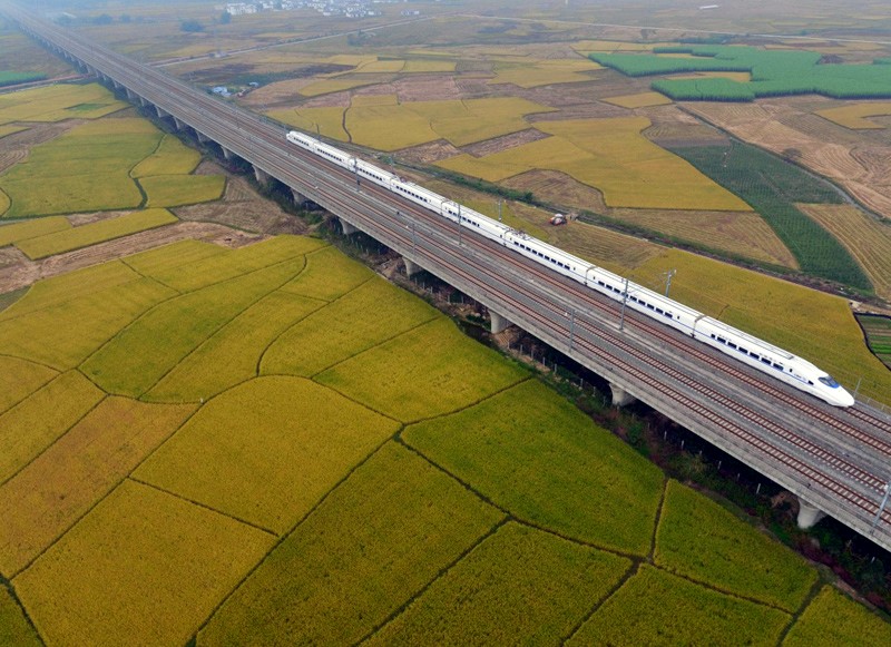 2016年11月6日,在廣西賓陽縣古辣鎮,一列列車駛過金色稻田。時下,廣西各地晚稻陸續成熟,田園一派豐收景象。