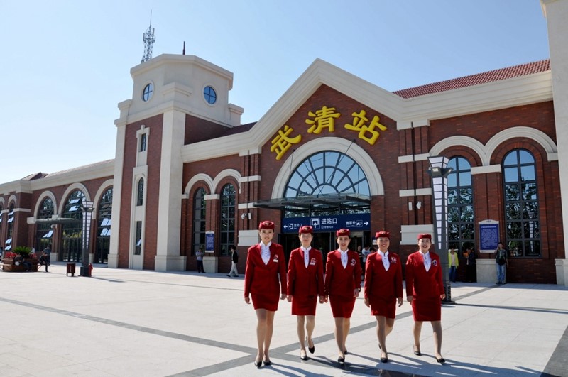 乘務(wù)人員在京津城際武清車(chē)站前合影。