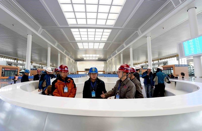 昆明南站建設收尾階段,工程人員在候車大廳查看旅客服務臺。