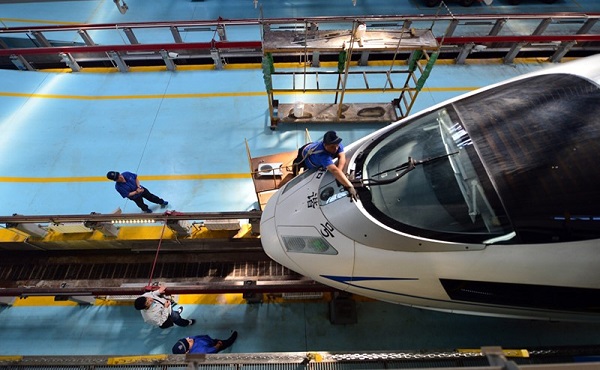 2014年9月26日,在沈陽沈北動車所,技術人員給高鐵列車進行日常檢修。