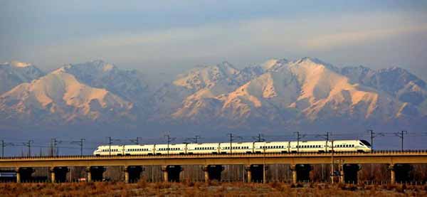 蘭新高鐵動(dòng)車組列車在天山腳下行駛。
