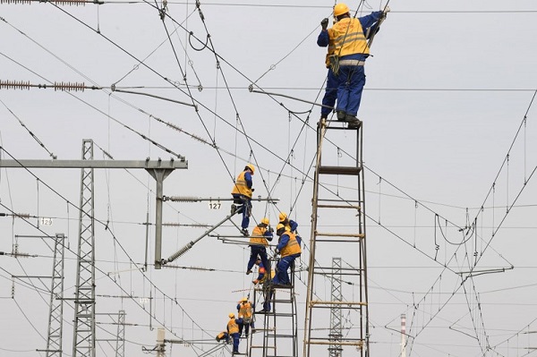 3月19日,工人們在唐呼線張集段古營盤站場進行線網改造。