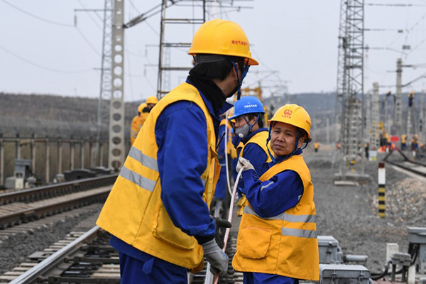 3月19日,工人們在唐呼線張集段古營盤站場進行換線作業。