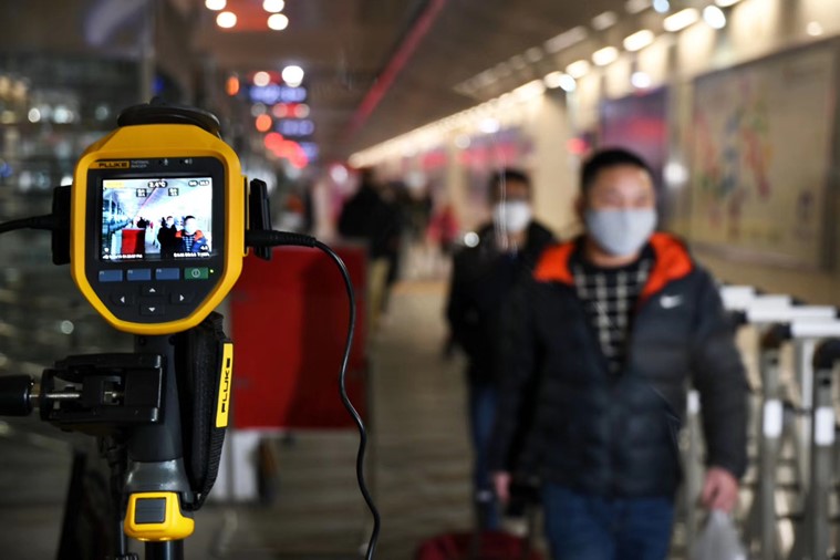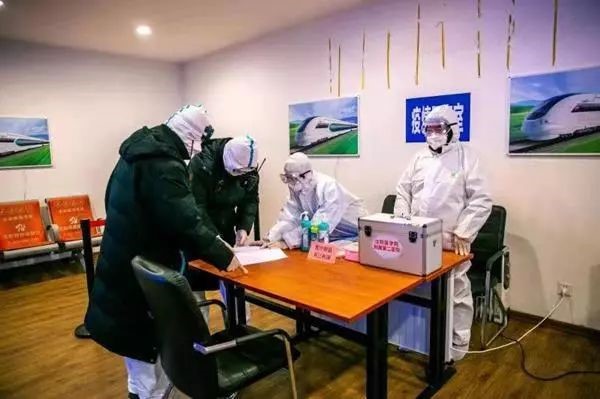圖為天津西站客運(yùn)人員在出站口為每位下車出站旅客進(jìn)行體溫監(jiān)測(cè)。
