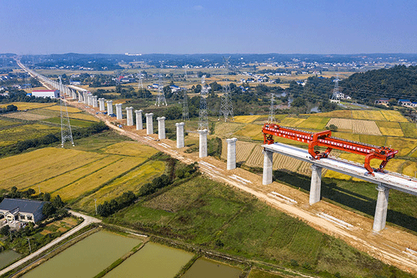 常(德)益(陽)長(沙)鐵路益長段進入架梁高峰。常益長鐵路正線全長約157公里,設計時速為350公里,是國家“八縱八橫”高速鐵路網的重要組成部分,其中益長段正線全長約65公里。