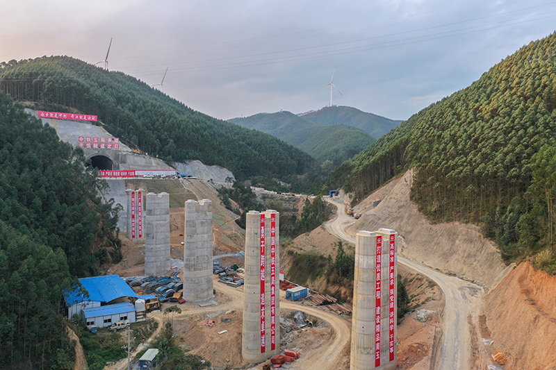 南(寧)玉(林)高鐵是南寧至深圳高鐵的重要組成部分,設計時速350公里,目前工程建設進展順利。圖為南玉高鐵6標段平悅隧道和山間橋墩建設現場。