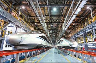 圖為1月12日,鄭州南動車所檢修庫內停放的動車組列車。