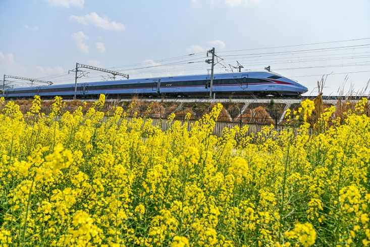 早春時節,貴州省黔東南苗族侗族自治州境內的油菜花、桃花、櫻花次第盛開,動車組列車穿行其間,一路繁花,美不勝收。