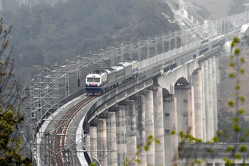 動態檢測列車行駛在金臺鐵路臺州市仙居縣境內的線路上(2021年3月18日攝)。金臺鐵路是浙江省第一條自主建設、自主運營的電氣化鐵路。