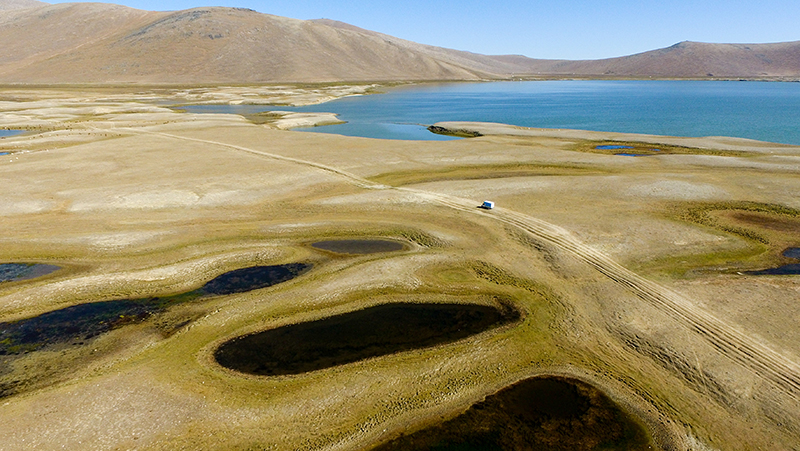 快遞車將網購的商品送到新疆青河縣查干郭勒鄉薩爾布拉克村的牧場(2018年8月24日攝,無人機照片)。