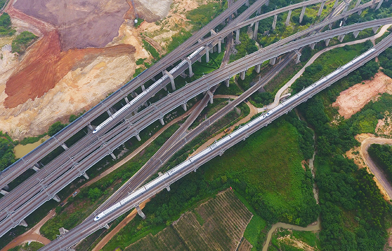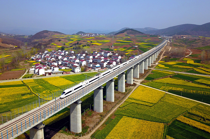 動車組列車行駛在西成高鐵陜西漢中洋縣段(2019年3月20日攝,無人機照片)。