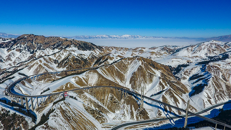 連(云港)霍(爾果斯)高速公路新疆果子溝段穿越天山山脈(2018年1月26日攝,無人機照片)。