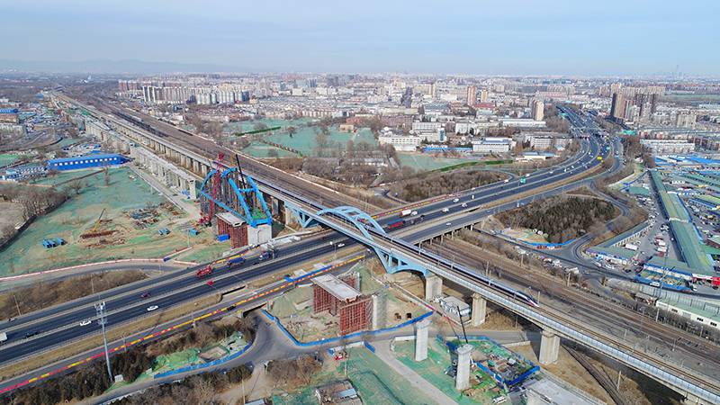 由北京南站開往上海虹橋方向的G9次動車組列車經過黃村橋(2019年1月5日攝,無人機照片)。