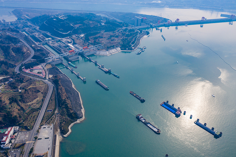 船舶有序行駛在三峽五級船閘上游引航道(2021年1月10日攝,無人機照片)。