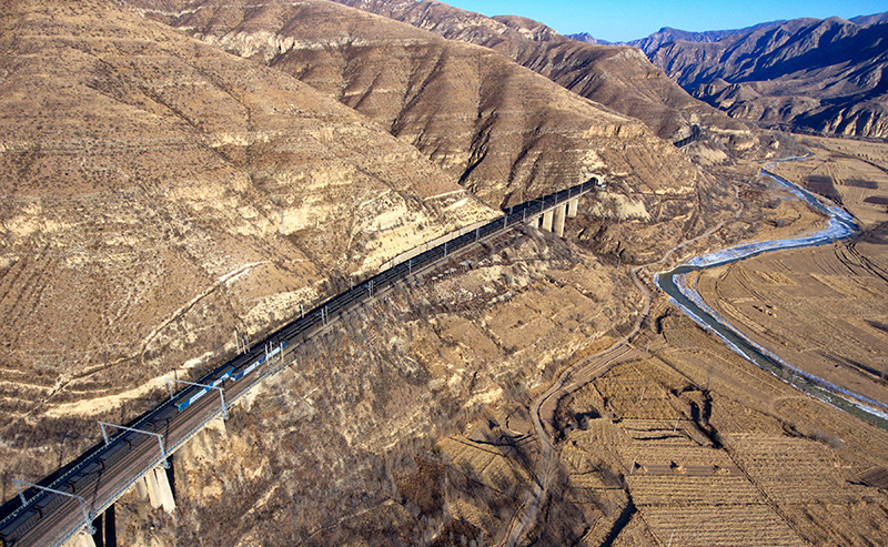 重載列車行駛在桑干河旁的大秦鐵路上(2018年12月6日攝,無人機照片)。