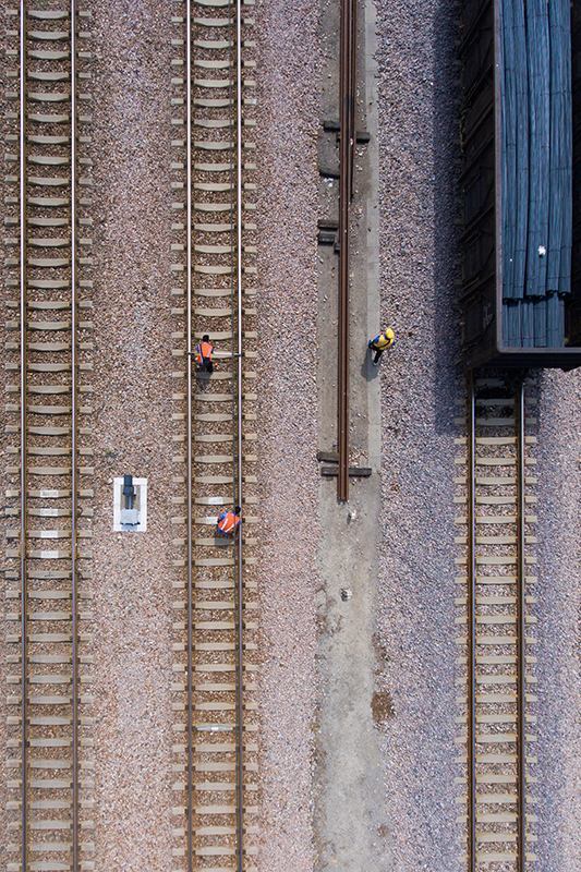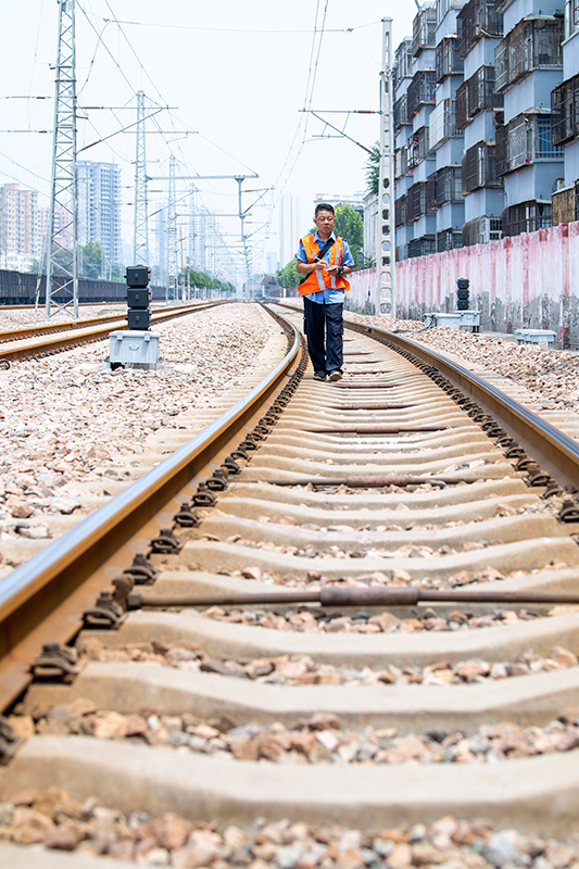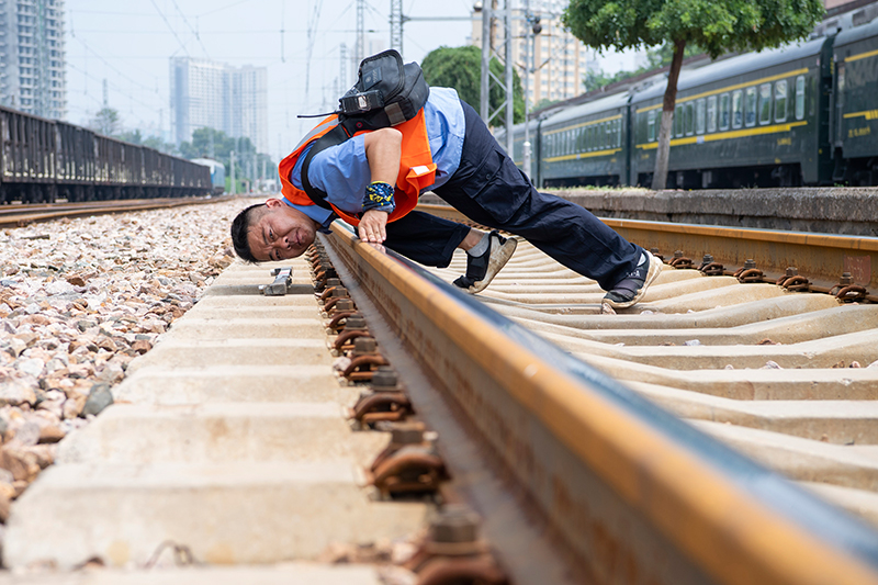 8月11日,在南同蒲線運城站,李寧俯身目測線路水平變化。