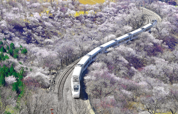 4月2日,北京居庸關(guān)長(zhǎng)城腳下,市郊鐵路S2線列車行駛在花海中。每年3月底至4月初,這里的山桃花、杏花爭(zhēng)相盛開,吸引了眾多旅客乘火車到此觀景留影。