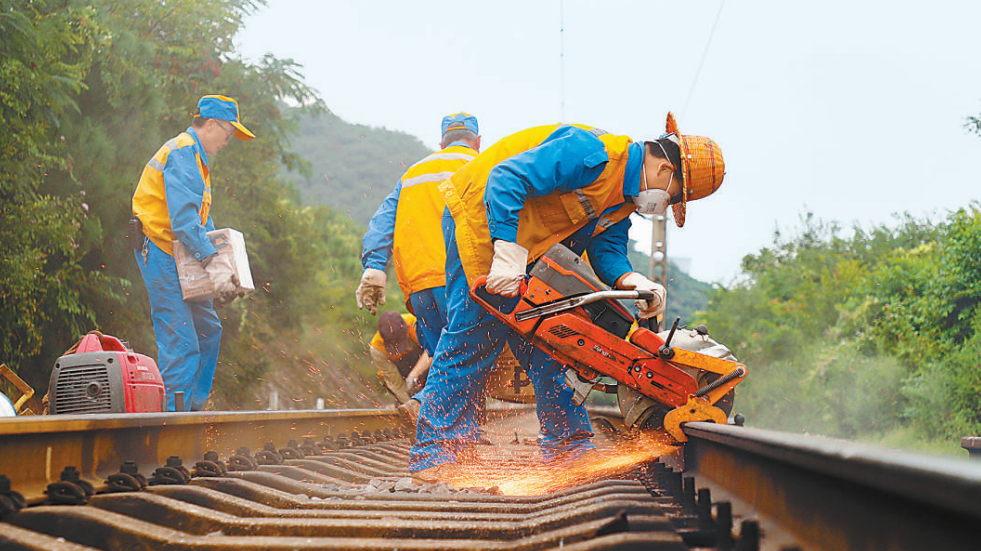 中國鐵路昆明局集團施工人員在成昆復線甸尾至廣通區間作業。