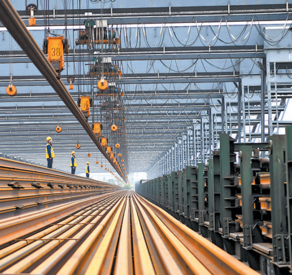 成都工務大修段石板灘焊軌基地職工在裝運鋼軌,準備發運至成昆復線施工現場。