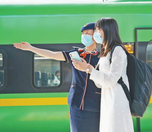 昆明站站臺上,列車工作人員在引導旅客出行。
