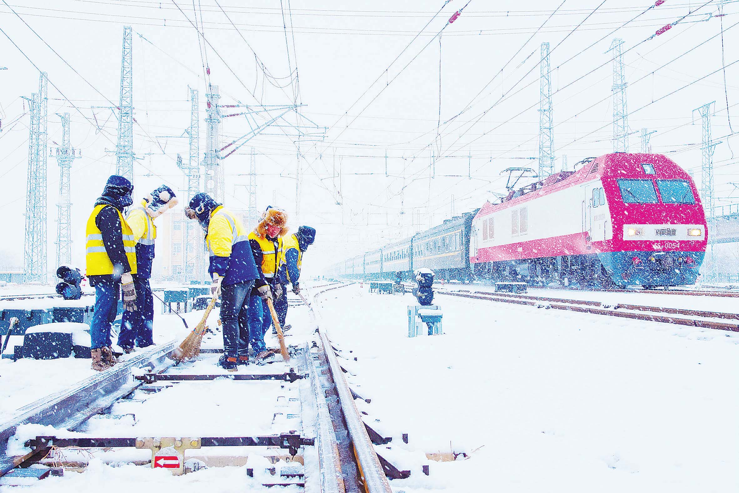 為了保障旅客雪天出行安全,站車單位迅速啟動雨雪天氣應(yīng)急預(yù)案,加強運輸組織和站車服務(wù),保證餐飲供應(yīng)和取暖,并采取有效措施引導(dǎo)旅客有序進出站,維護良好的候乘秩序;設(shè)備線路單位及時掃除線路積雪,檢查維護設(shè)備,保證線路設(shè)備狀態(tài)良好,確保線路暢通。